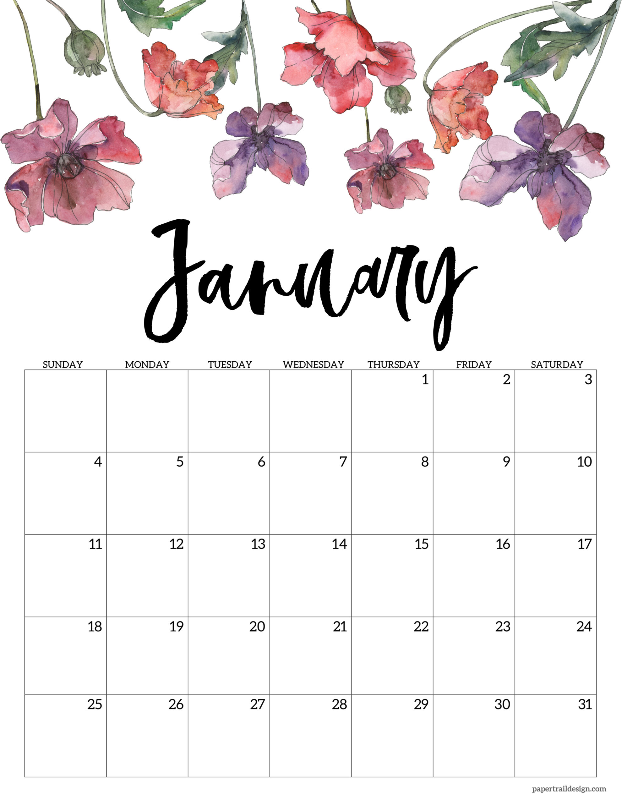 2026 Free Printable Calendar Floral